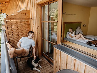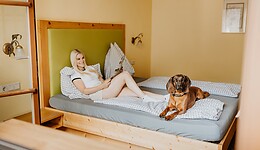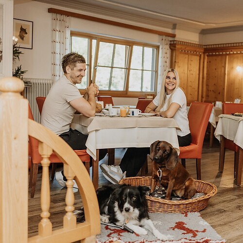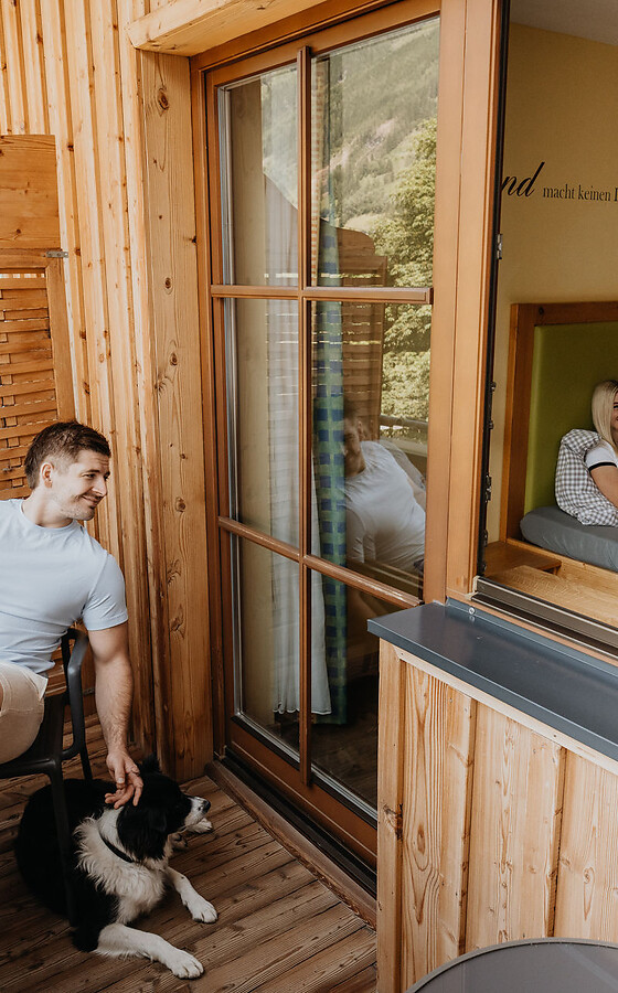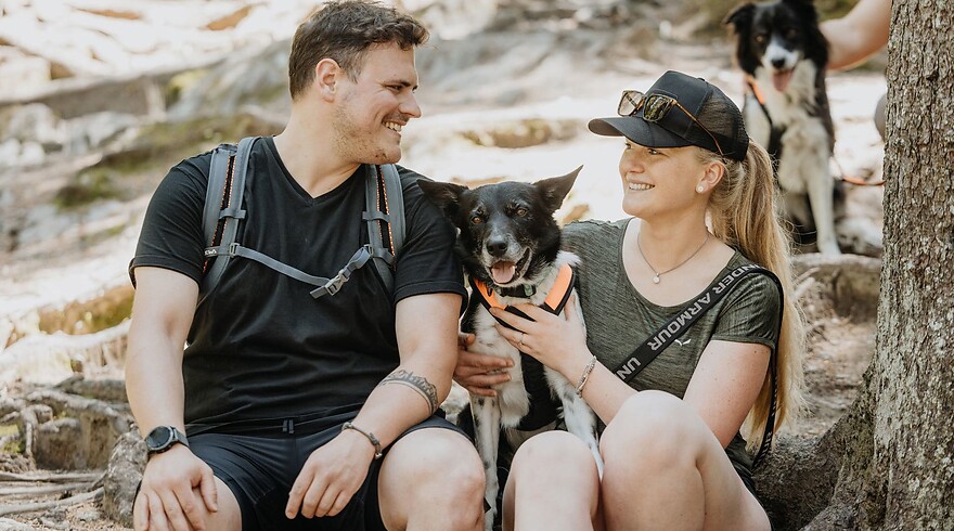 At Hotel Grimming, you’re welcome to bring as many dogs as you like – and they’re free to accompany you throughout the entire hotel. All our dog services are, of course, included: personalised foods, access to the dog centre and the dog lounge for grooming and care. Owners can look forward to cosy rooms, a sauna and relaxation area, as well as our delicious half‑board with breakfast, afternoon snacks and an evening menu. On warm summer days, everyone enjoys hiking, biking and outdoor adventures together.